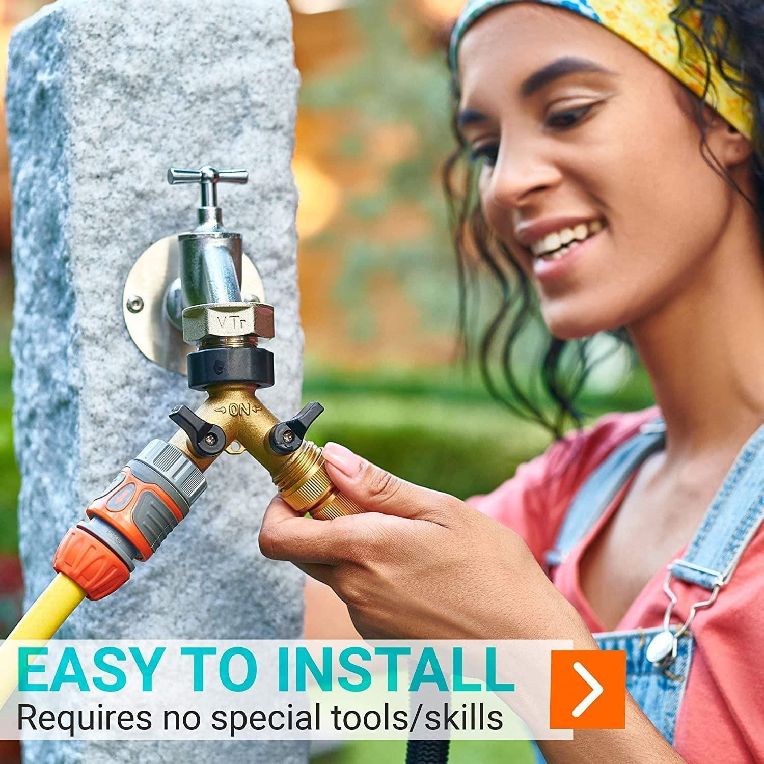 Made to be used extensively without failures. The body of the outdoor faucet splitter is made of solid brass, which ensures excellent durability and longevity. The water hose splitter 2 way will withstand heavy pressure and any weather conditions, be it rain or frost. The top connector and valve handles are made of rubbered ABS plastic that allows easy grip and flawless operation. Handles are also secured with metal bolts to avoid disconnecting.